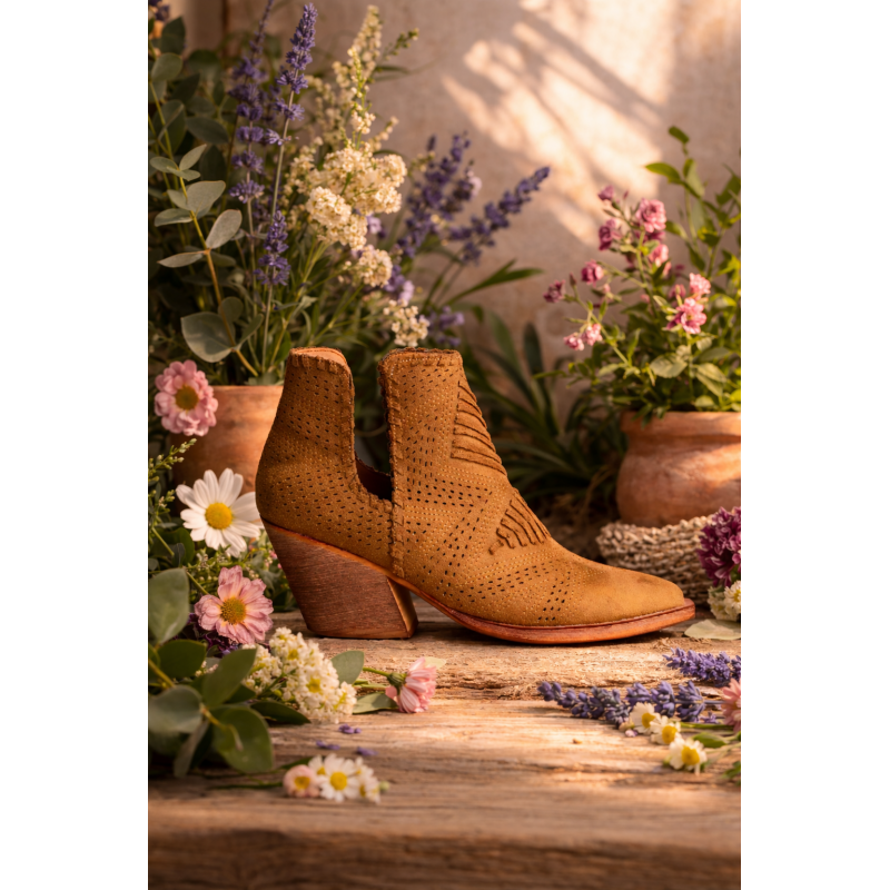 Bota estilo campero. Caña con detalle de pasados. Detalles bordados en la punta y caña.