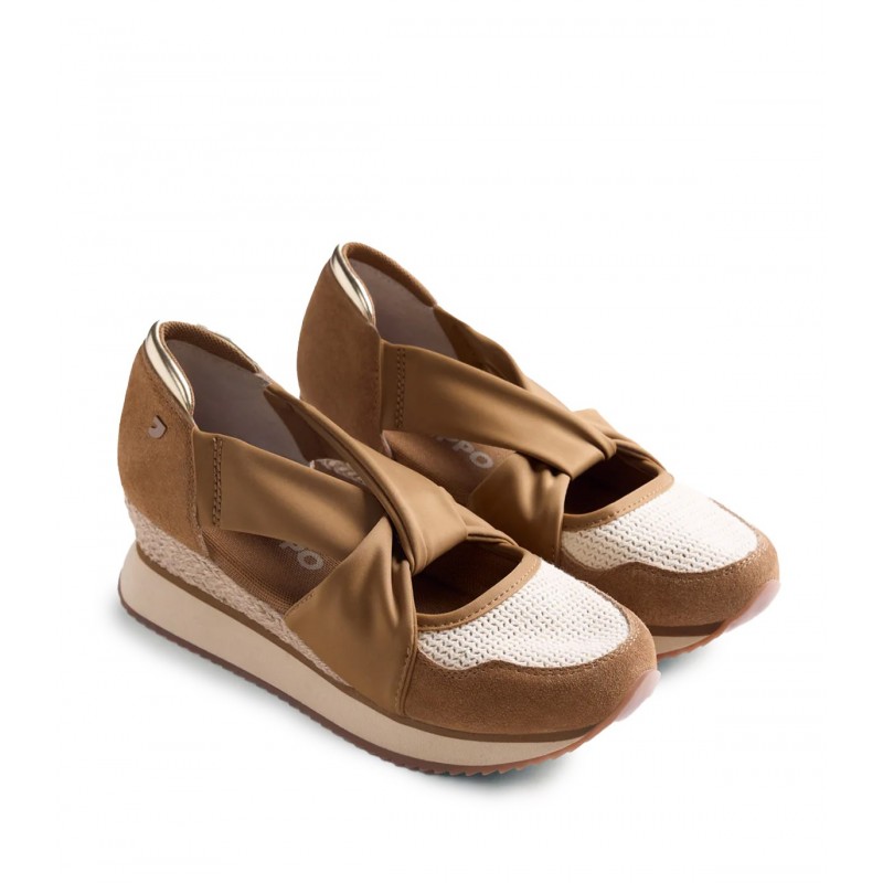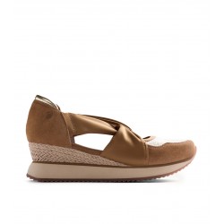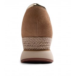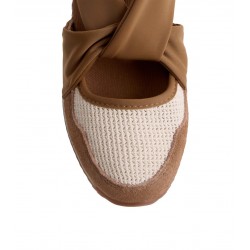 Zapatillas abiertas con piel serraje, crochet hecho a mano y cuña forrada estilo yute. Cuentan con planta acolchada y tiras de sujeción a lo largo del empeine. Altura cuña: 5,5 cm.