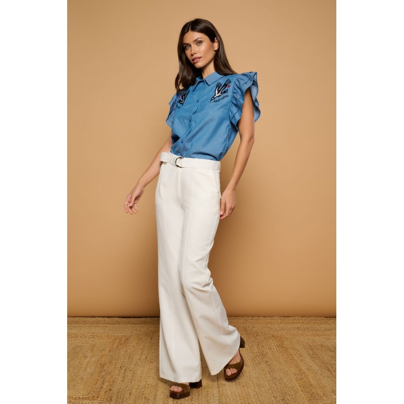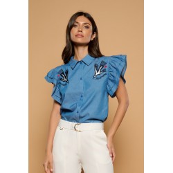 Camisa de cuello solapa y manga corta de volantes. Detalle de pájaros bordados en frontal y salamandras y corazón en espalda. Cierre con botones frontales. Tejido mezcla de algodón.
