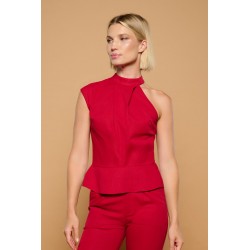 Top de cuello halter con hombros asimétricos. Manga corta y hombro descubierto. Peplum en bajo. Cierre con cremallera trasera. Tejido en mezcla de algodón y lino.