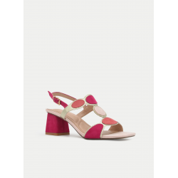Las piezas circulares en el empeine, en una armonía de rosas y tonos suaves, aportan un aire artístico y muy femenino, convirtiéndolas en unas auténticas sandalias elegantes con personalidad propia. La punta cuadrada y el tacón ancho cómodo estilizan la silueta ofreciendo estabilidad y seguridad en cada paso.
