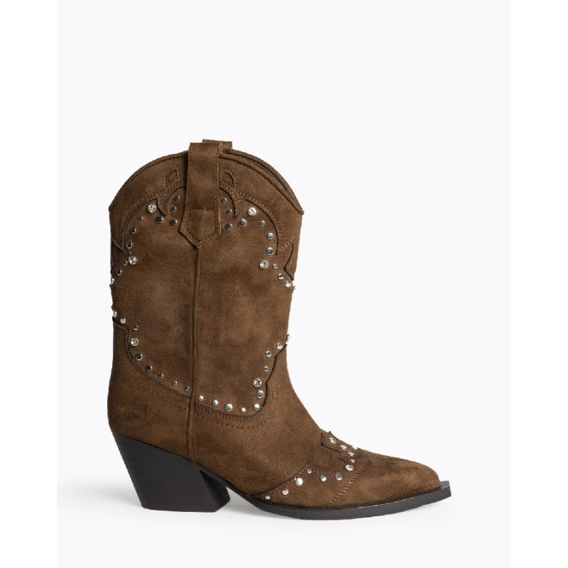 Botín de tacón medio, estilo cowboy. Cremallera en el lateral. Caña y puntera con detalles bordados y combinación de tachas y diamantes.