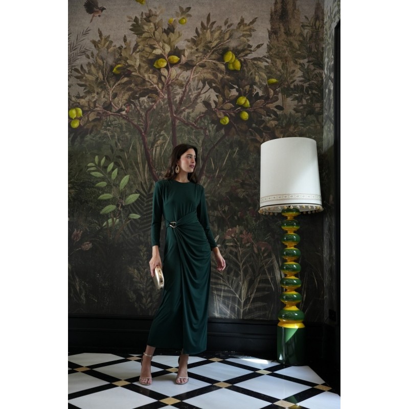 Vestido confeccionado en punto de seda. Detalle de hebilla dorada que une el pareo drapeado. Frunces en hombro con hombreras interiores. Lleva forro interior y cremallera invisible en espalda.